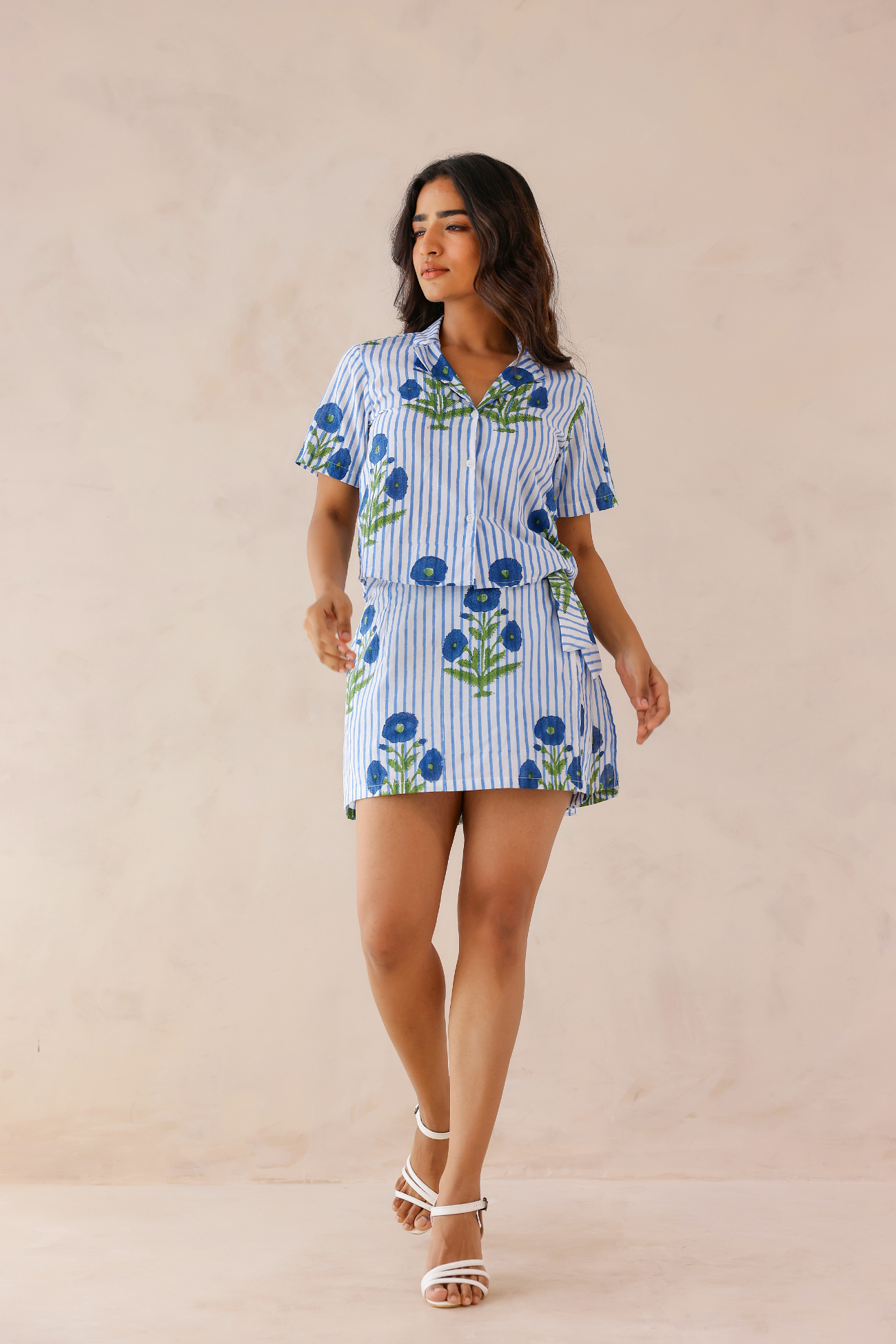 A fresh take on summer co-ords — this Handblock Blue Floral Stripe Printed Coord Set features an airy short-sleeve shirt paired with a matching mini skirt. Handblock printed by skilled artisans, the beautiful floral motifs pop against soft blue and white stripes, creating a look that’s both timeless and playful.
