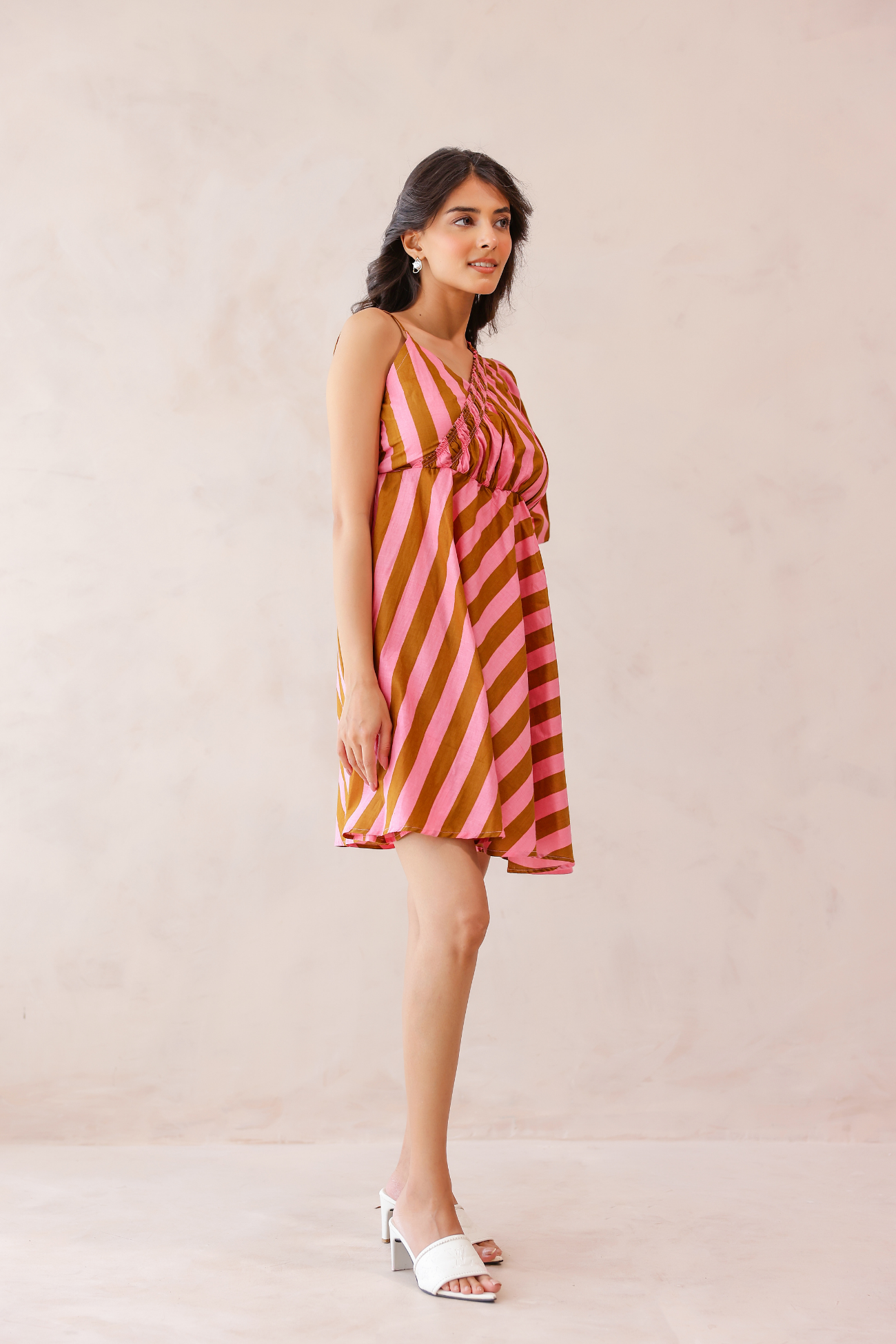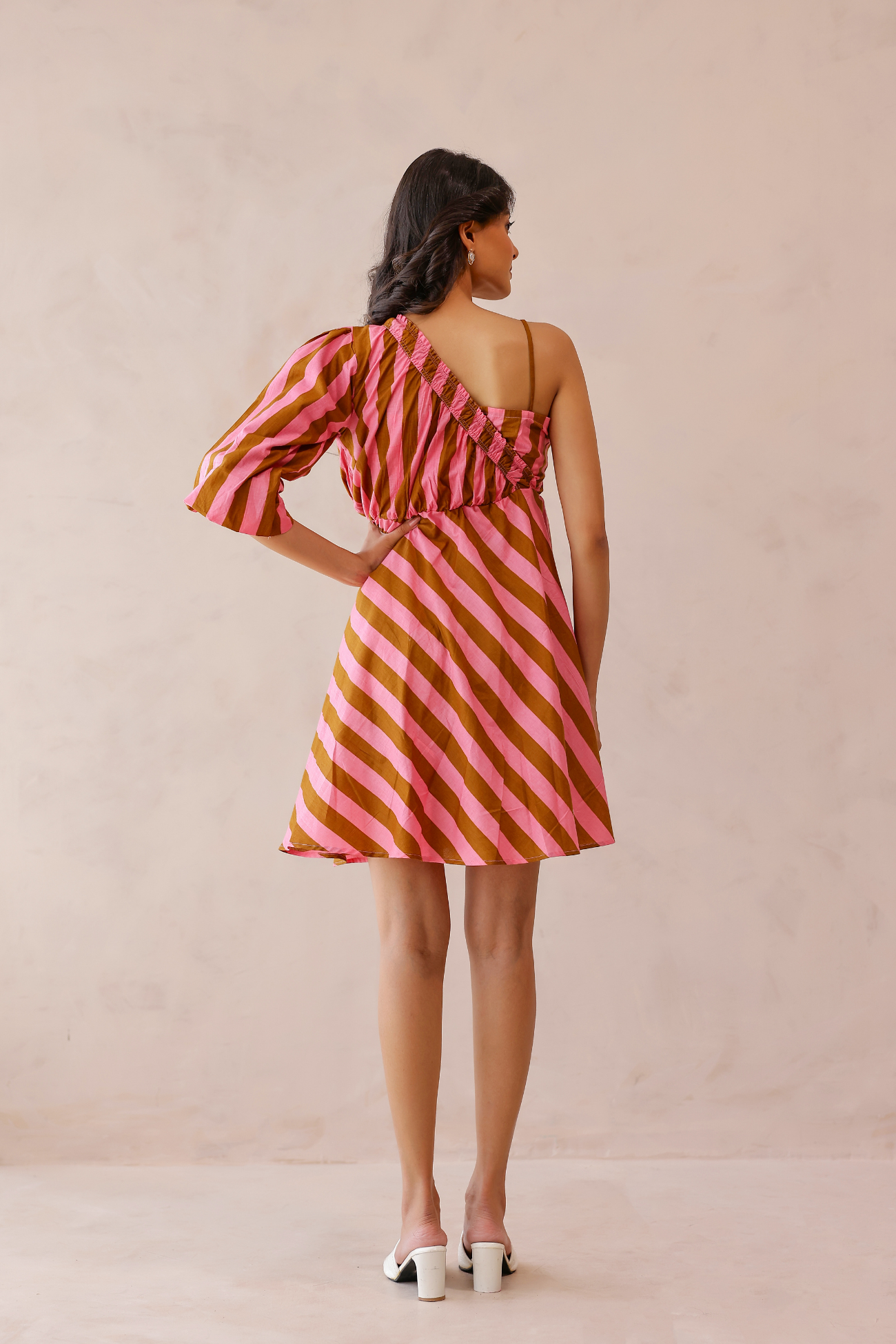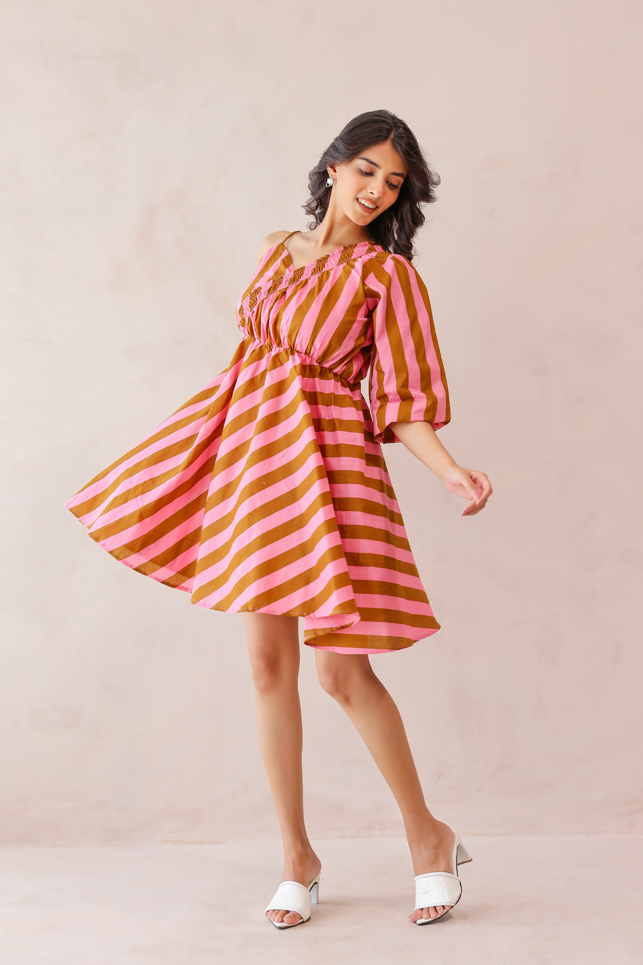 Turn heads this season with our Candy Stripe One Shoulder Dress — a playful blend of bold pink & mustard stripes in a breezy cotton silhouette. The statement one-shoulder design with puff sleeve adds drama, while the flared hem gives it effortless movement — perfect for brunch dates, holidays, or twirling on the dance floor.