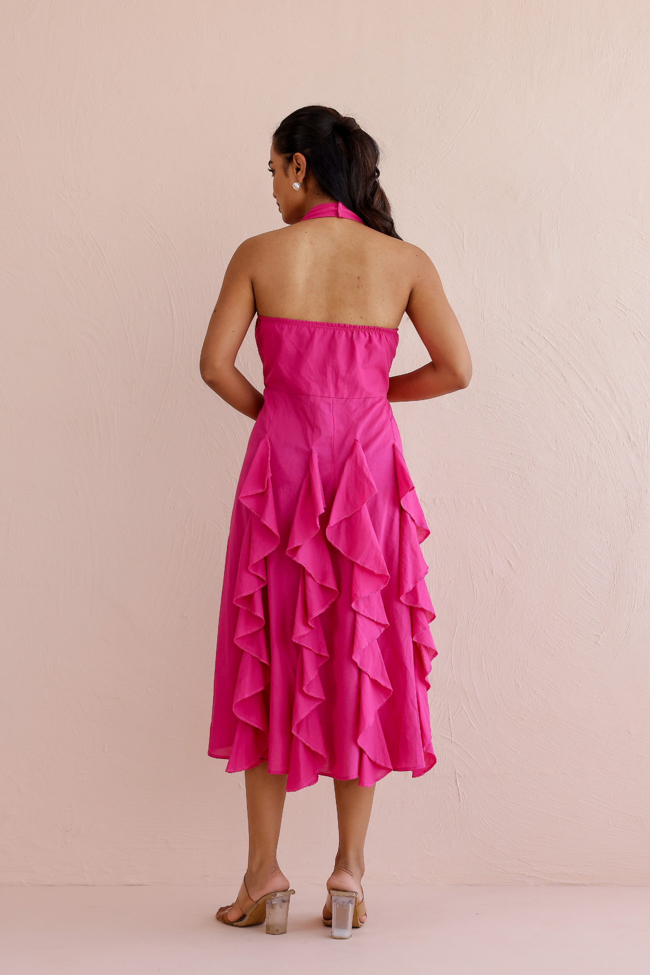 Make an unforgettable entrance in our Fuchsia Ruffle Cascade Dress – a celebration of movement, color, and summer confidence. Featuring a flattering halter neckline and a fit-and-flare silhouette, this midi dress is elevated with playful tiered ruffles that flow with every step.