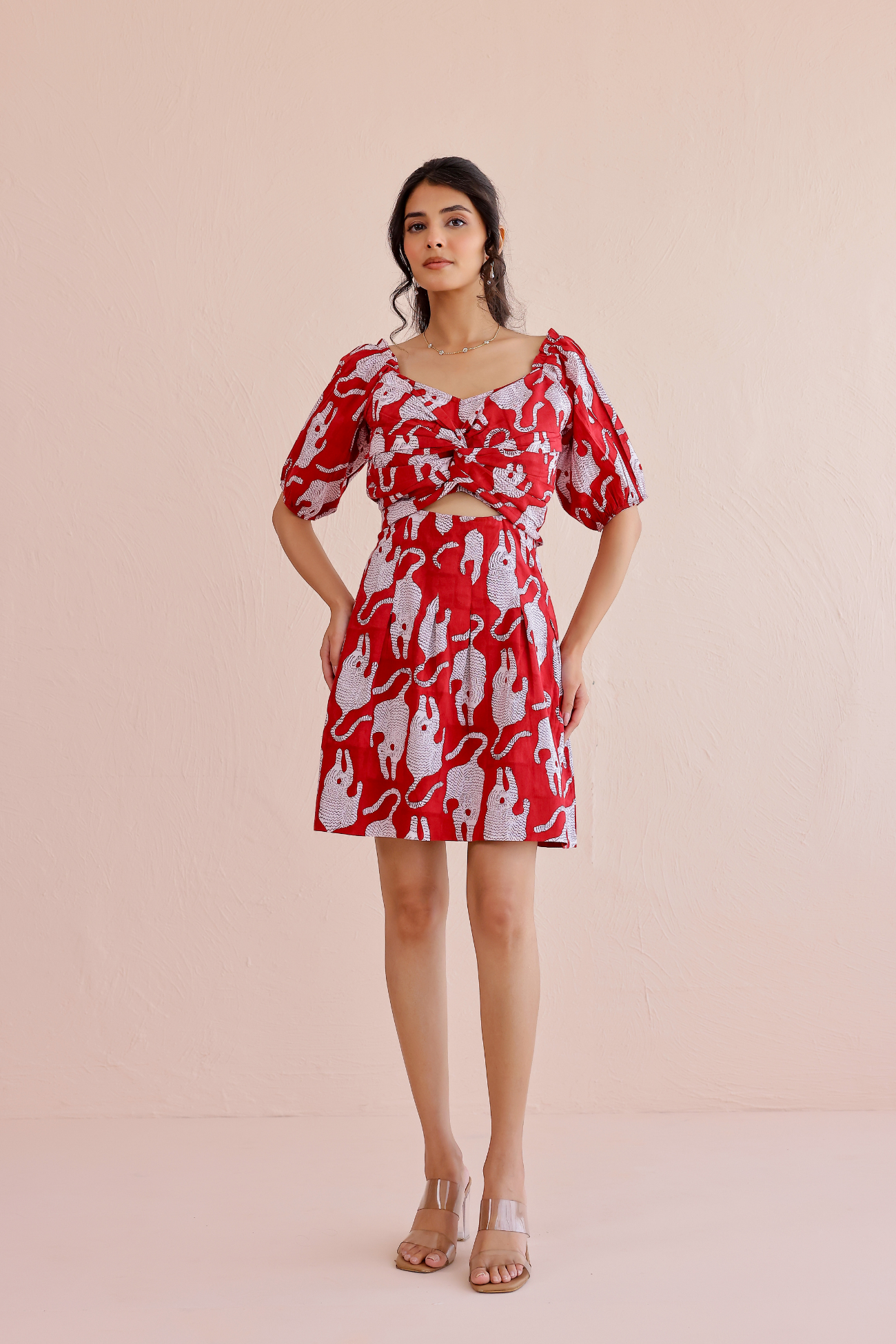 Featuring a twist-knot front, cut-out waist, and puff sleeves, this dress brings handcrafted tradition into effortless everyday fashion.