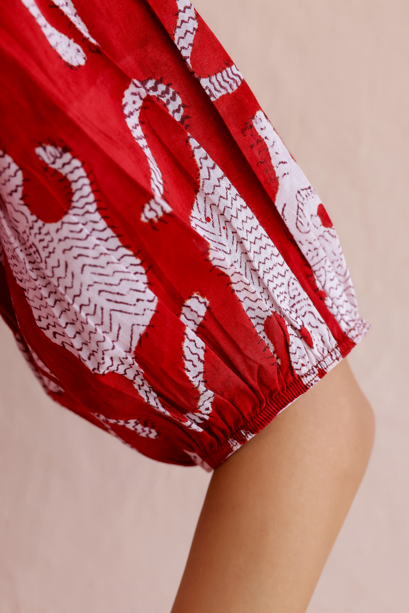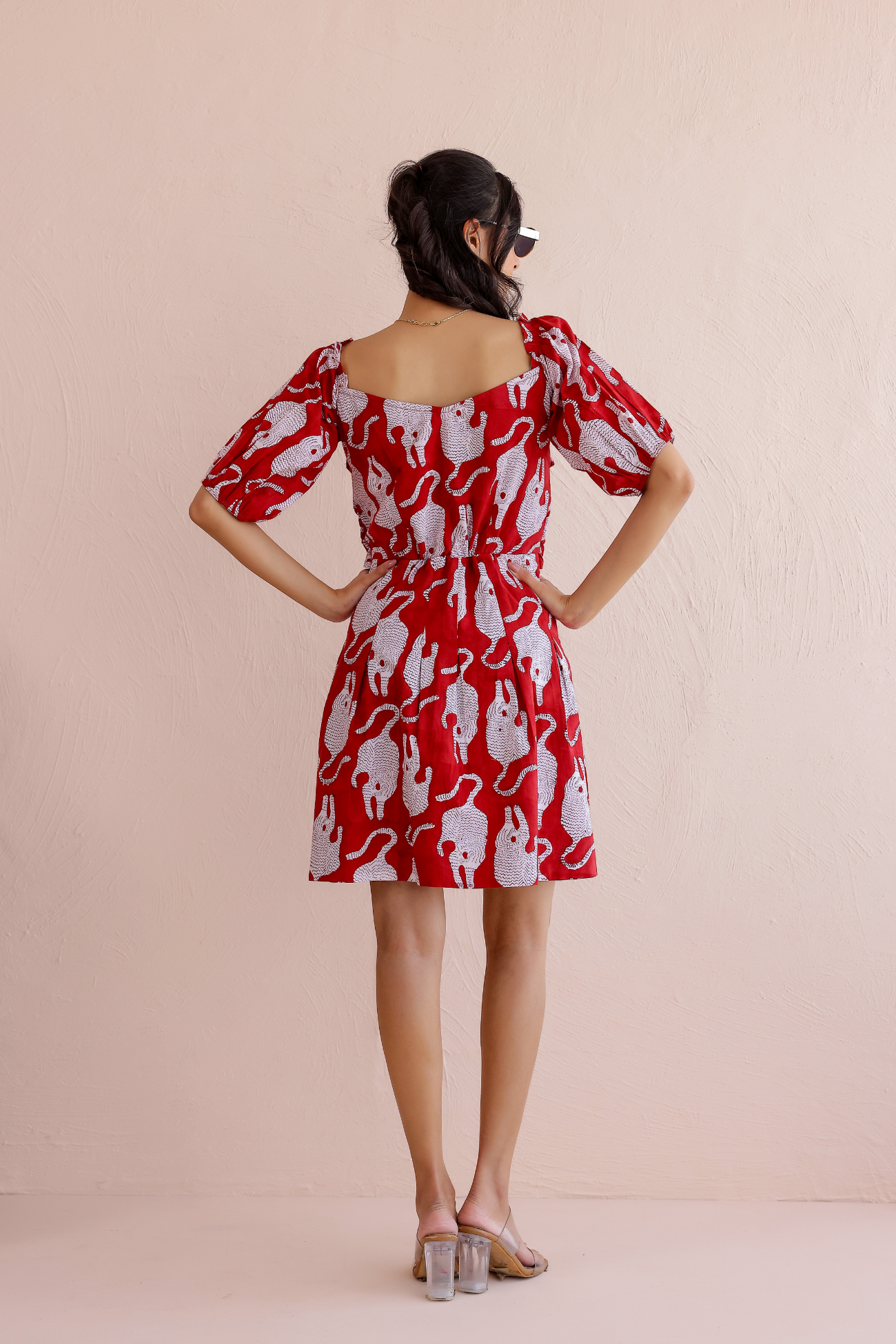 Make a bold yet timeless statement with our Wild Whimsy Handblock Dress, adorned with intricate white tiger motifs printed by hand on a rich Bagru red base. This piece beautifully blends heritage printing techniques with a playful, modern silhouette.