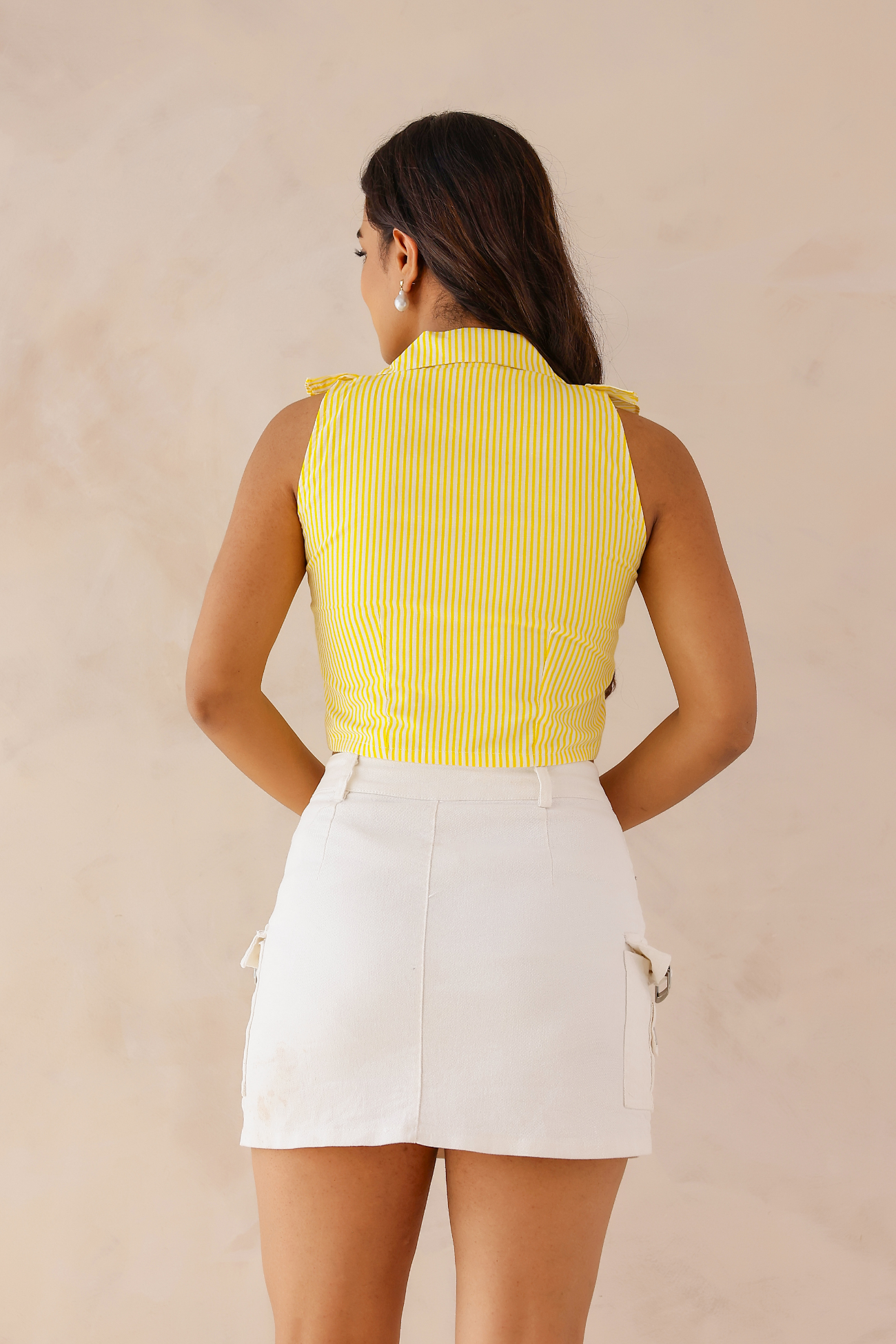 Bring sunshine to your style with this Lemon Zest Striped Cropped Ruffle Shirt — your go-to for bold, fun summer looks. Designed with eye-catching yellow stripes, flirty ruffle detailing, a deep v-neckline, and cropped silhouette, this sleeveless summer top screams summer chic.