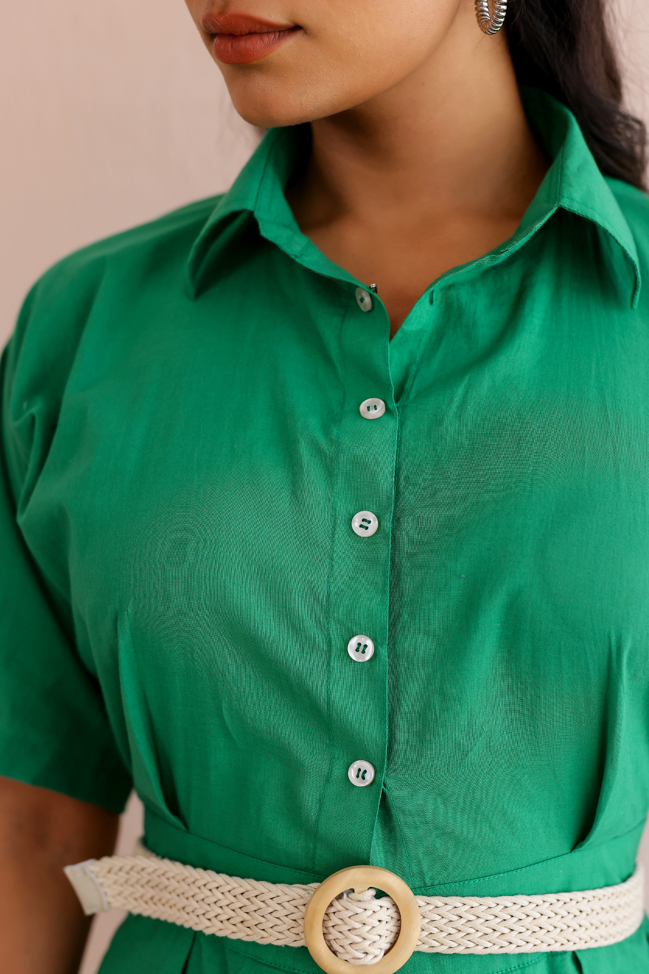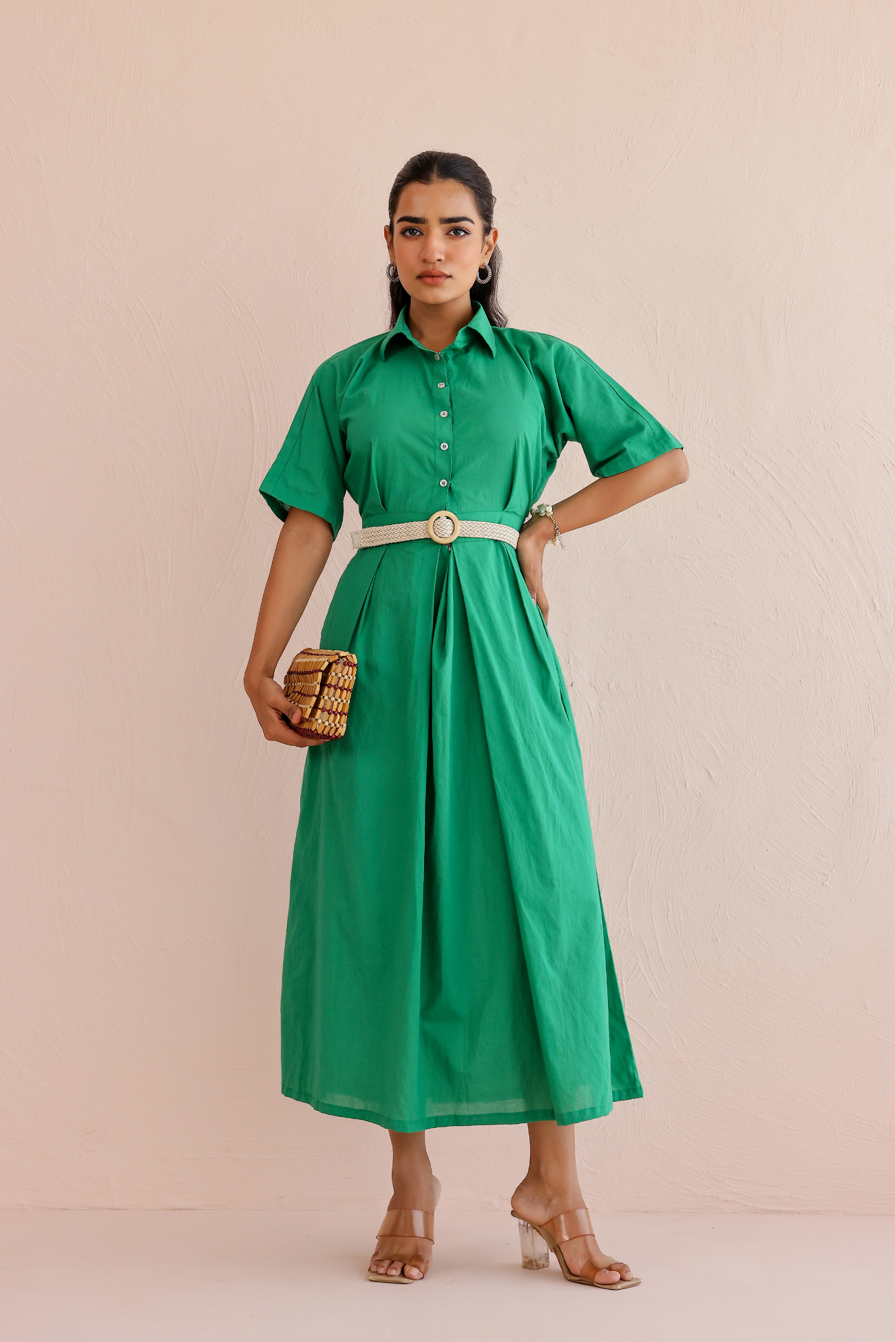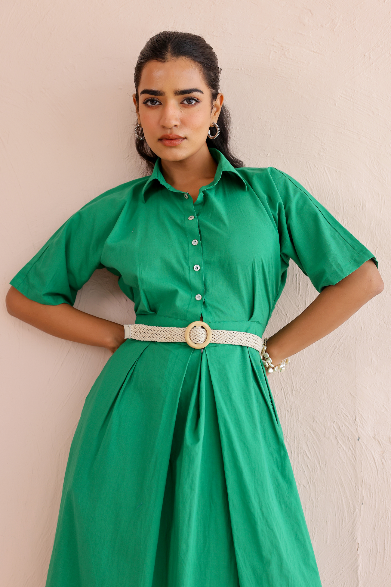 Say hello to effortless sophistication with the Meadow Pleat Dress in a lush emerald green hue. Crafted in 100% soft cotton, this dress features a sharp shirt collar, neat front button placket, and dramatic box pleats that add flow and finesse to every step.