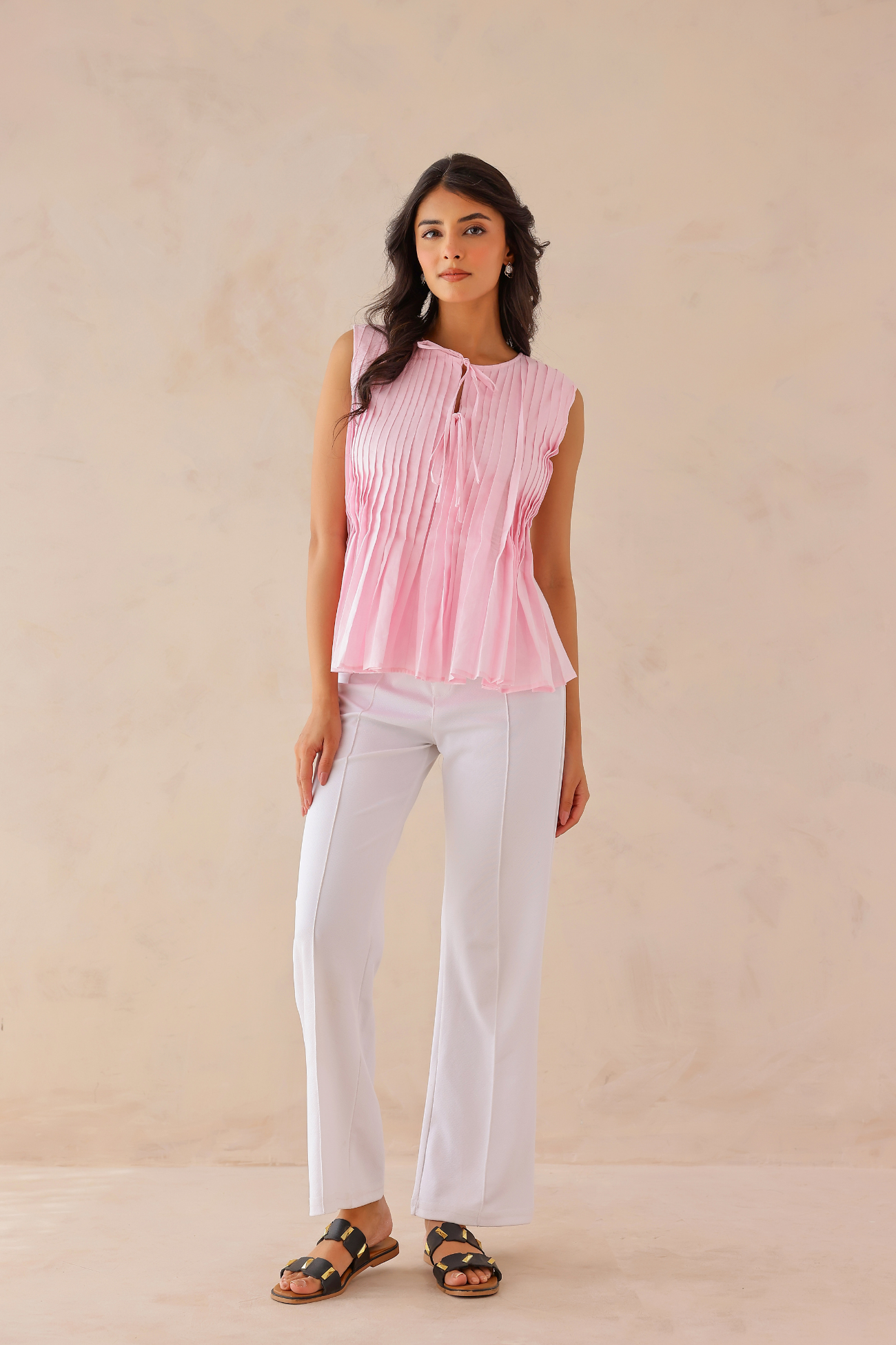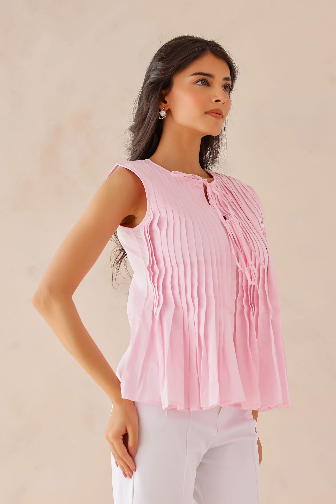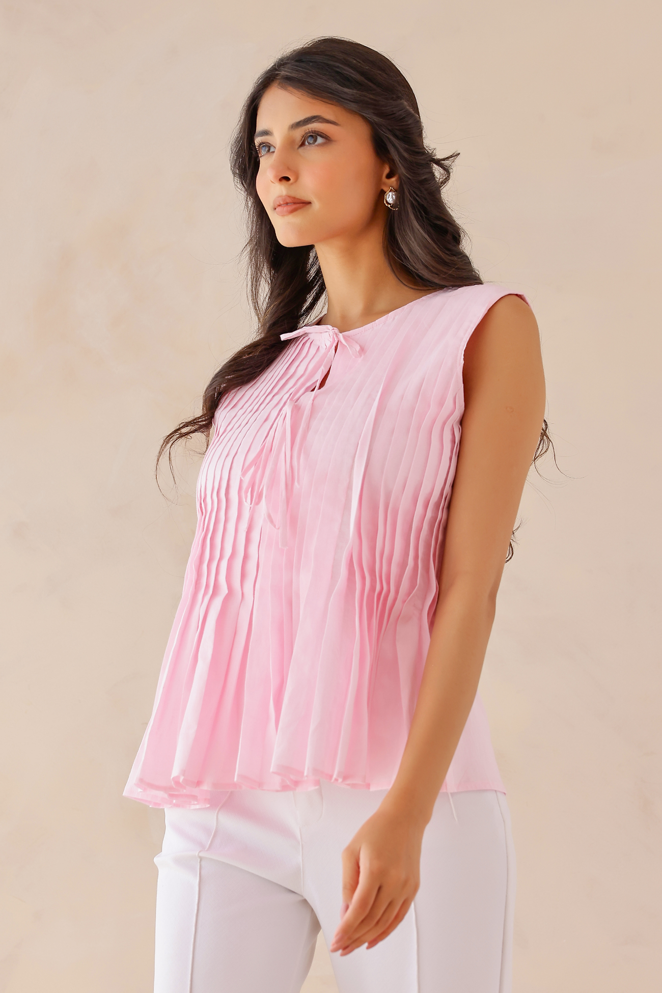 Add a touch of effortless grace to your wardrobe with this Pink Pleated Top for Women. Designed with beautiful pleated detailing and a soft tie-up neckline, this breezy summer top flatters every silhouette while keeping your look polished.