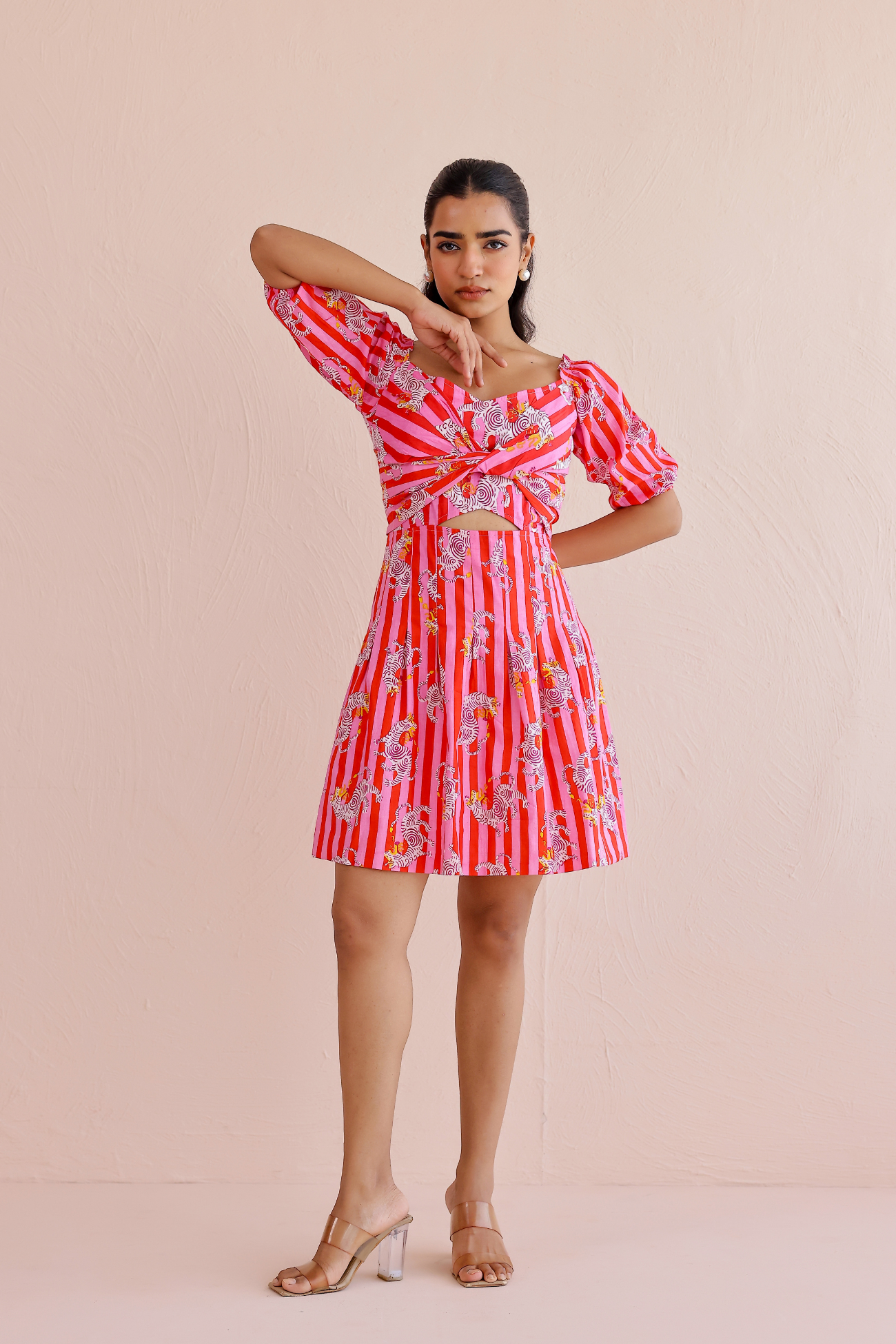 Sweet, sassy, and oh-so-stylish — the Tropic Twirl Dress is your sunshine statement piece. Designed in candy red and pink stripes with playful yellow florals, it features a flattering twist-front cut-out and a fit-and-flare silhouette that moves beautifully with every step.
